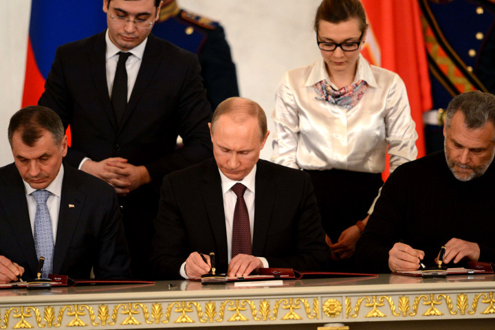| ប្រធានាធិបតីរុស្ស៊ី លោក Putin ក្នុងពិធីចុះហត្ថលេខា រួមបញ្ចូលគ្រឺមជាឧសម្ព័ន្ធ (រូបថតៈGetty Images/ AP ) |