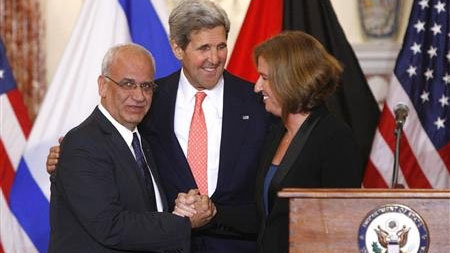 ចរចារប៉ាឡេស្ទីនលោក Saeb Erakat រដ្ឋមន្ត្រីការបរទេសអាមេរិកលោក John