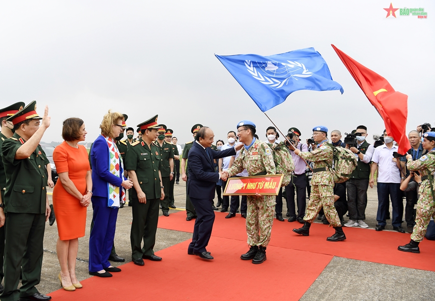 ប្រធានរដ្ឋលោក Nguyen Xuan Phuc និងគណៈប្រតិភូបានអញ្ជើញជូនដំណើរសមាជិកកងពេទ្យកម្រិតទី ២ លេខ ៤ ឡើងយន្តហោះទៅកាន់ប្រទេសស៊ូដង់ខាងត្បូង ដើម្បីបំពេញបេសកកម្មរក្សាសន្តិភាពរបស់អង្គការសហប្រជាជាតិ (រូបថត៖ Tuan Huy/ qdnd.vn) |