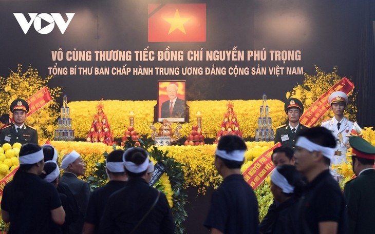 នាព្រឹកថ្ងៃនេះដែរ ប្រទេសជាច្រើនបានបញ្ជូនគណៈប្រតិភូតំណាងទៅគោរពវិញ្ញាណក្ខន្ធលោកអគ្គលេខាបក្ស ង្វៀន ភូ ជុង។