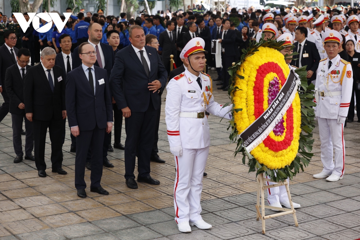 គណៈប្រតិភូសហព័ន្ធរុស្ស៊ី ដឹកនាំដោយអនុប្រធានឌុយម៉ាជាតិរុសកស៊ី Pyotr Tolstoy អញ្ជើញចូលគោរពវិញ្ញាណក្ខន្ធអគ្គលេខាបក្ស ង្វៀន ភូ ជុង (រូបថត៖ VOV) |