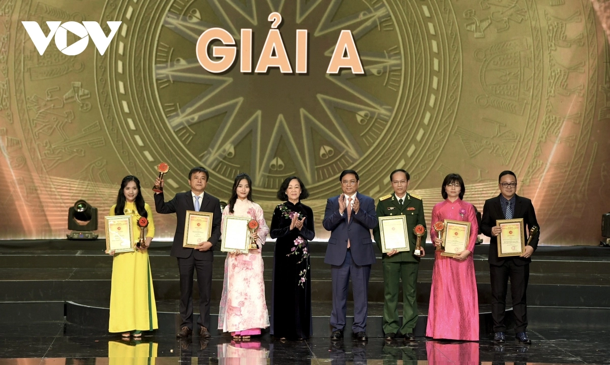 លោកនាយករដ្ឋមន្ត្រី Pham Minh Chinh និងសមាជិកអចិន្ត្រៃយ៍គណៈលេខា ប្រធានគណៈកម្មាធិការចាត់តាំងមជ្ឈិម លោកស្រី Truong Thi Mai ប្រគល់រង្វាន់ថ្នាក់ A ដល់អ្នកនិពន្ធ និងក្រុមអ្នកនិពន្ធ។ (រូបថត៖ VOV) |