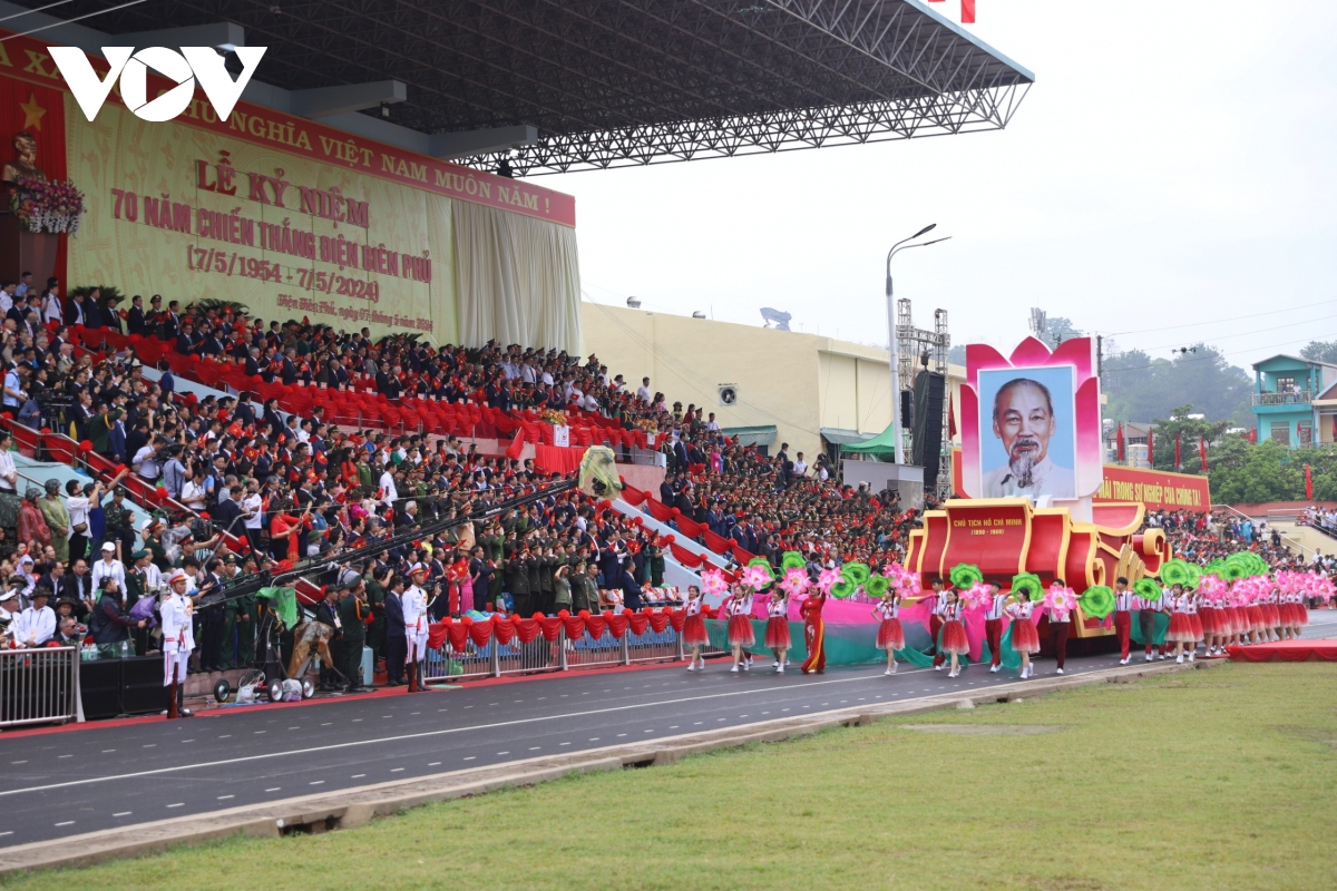 បន្ទាប់ពីពិធីមិទ្ទីង គឺពិធីក្បួនព្យុហយាត្រារយោធារំលឹកខួបលើកទី ៧០ នៃជ័យជំនះ Dien Bien Phu ដោយមានការចូលរួមពីប្រជាជនប្រហែល ១២.០០០ នាក់ រួមទាំងកងកម្លាំងទាំងអស់នៃកងទ័ព កងជីវពល កងស្វ័យការពារ ប៉ូលីស និងមន្ទីរអង្គភាពនានា។