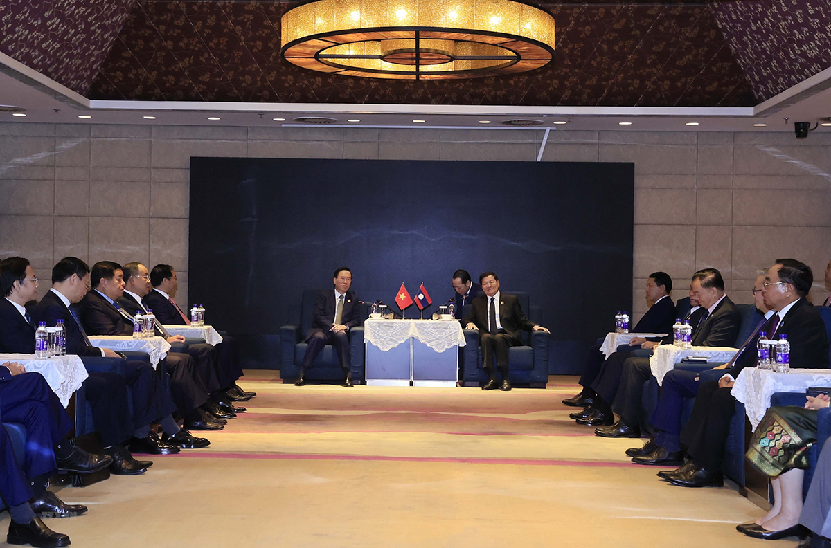 ប្រធានរដ្ឋវៀតណាម លោក Vo Van Thuong ជួបជាមួយអគ្គលេខាបក្ស និងជាប្រធានរដ្ឋឡាវ លោក Thongloun Sisoulith។ រូបថត៖ Thong Nhat/TTXVN |