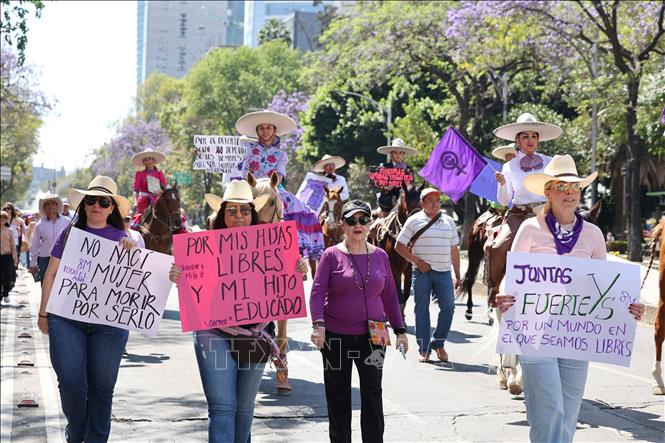 ទិដ្ឋភាពនៃការដង្ហែក្បួនអំពាវនាវឱ្យបញ្ចប់អំពើហិង្សា និងវិសមភាពយេនឌ័រនៅក្នុងរដ្ឋធានីនៃប្រទេសម៉ិកស៊ិក ក្នុងទិវាសិទ្ធិនារីអន្តរជាតិ (៨ មីនា ឆ្នាំ ២០២៥) (រូបថត៖ Phi Hung/TTXVN) |