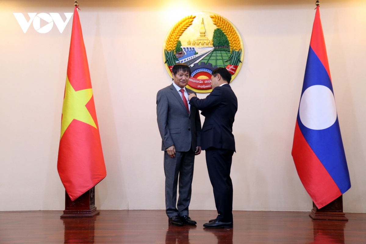 ឧបនាយករដ្ឋមន្ត្រី និងជារដ្ឋមន្ត្រីក្រសួងការបរទេសឡាវ លោក Saleurmxay Kommasith បានប្រគល់គ្រឿង Itxala ជូនឯកអគ្គរដ្ឋទូតង្វៀន ប៉ា ហ៊ុង ។ រូបថត៖ VOV/ឡាវ |