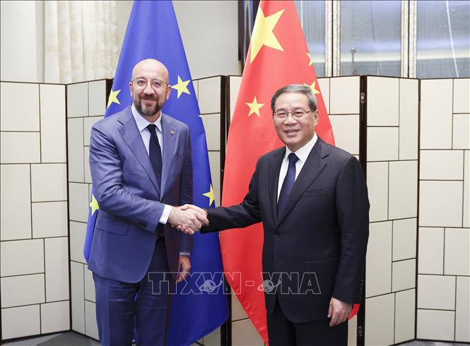 ប្រធានក្រុមប្រឹក្សាអឺរ៉ុប លោក Charles Michel (ឆ្វេង) និងនាយករដ្ឋមន្ត្រីចិន លោក Li Qiang ក្នុងកិច្ចប្រជុំនៅទីក្រុងប៉ារីស ប្រទេសបារាំង ថ្ងៃទី ២២ ខែមិថុនា ឆ្នាំ ២០២៣ (រូបថត៖ THX/TTXVN) |