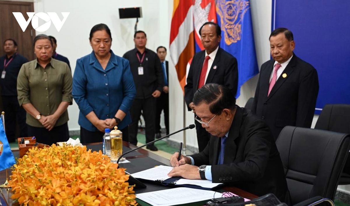 ប្រធានគណបក្សប្រជាជនកម្ពុជា សម្តេចតេជោ ហ៊ុន សែន ចុះហត្ថលេខា។ រូបថត៖ VOV |
