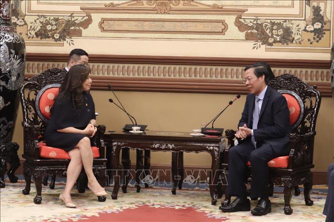 លោក Phan Van Mai ប្រធានគណកម្មាធិការប្រជាជនទីក្រុងហូជីមិញបានពិភាក្សាជាមួយលោកស្រី Mary Ng រដ្ឋមន្ត្រីក្រសួងអភិវឌ្ឍន៍សេដ្ឋកិច្ច ពាណិជ្ជកម្មអន្តរជាតិ និងការជំរុញការនាំចេញរបស់ប្រទេសកាណាដាក្នុងកិច្ចប្រជុំនេះ។ រូបថត៖ TTXVN |
