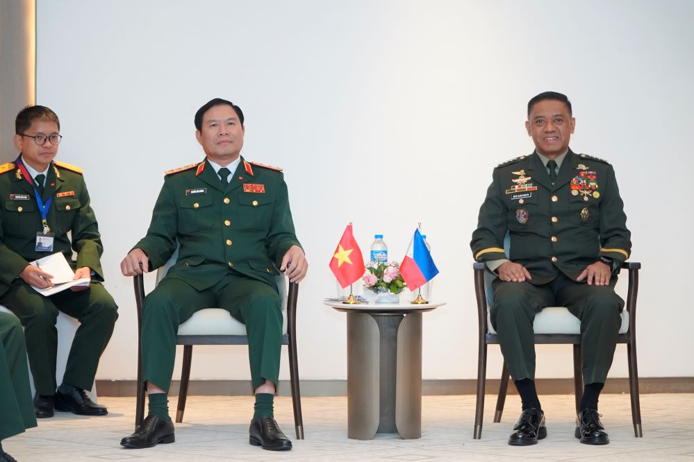 ឧត្តមសេនីយឯក Nguyen Tan Cuong ក្នុងជំនួបជាមួយលោក Romeo S Brawner Jr. អគ្គសេនាធិការនៃកងកម្លាំងប្រដាប់អាវុធហ្វីលីពីន។ រូបថត៖ VOV |