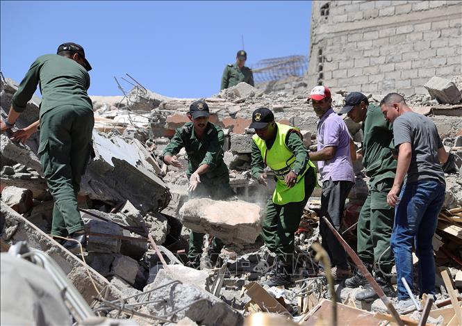ក្រុមអ្នកជួយសង្គ្រោះស្វែងរកជនរងគ្រោះដែលជាប់នៅក្រោមគំនរបាក់បែក បន្ទាប់ពីគ្រោះមហន្តរាយរញ្ជួយដីនៅ Amizmiz ប្រទេសម៉ារ៉ុក ថ្ងៃទី ១១ ខែកញ្ញា ឆ្នាំ ២០២៣ (រូបថត៖ THX/TTXVN) |