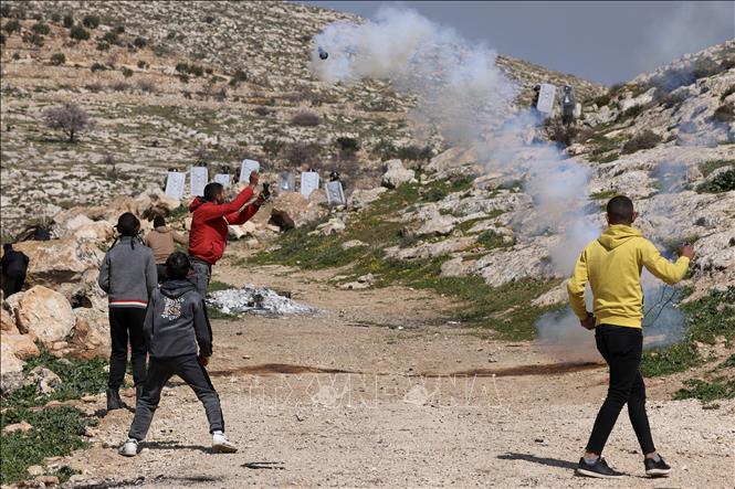 បាតុករប៉ាឡេស្ទីនប៉ះទង្គិចជាមួយកងកម្លាំងសន្តិសុខអ៊ីស្រាអែលនៅក្នុងក្រុង Nablus ថ្ងៃទី២៤ ខែកុម្ភៈ ឆ្នាំ២០២៣។ ស្នាដៃសិល្បៈ៖ AFP/TTXVN |