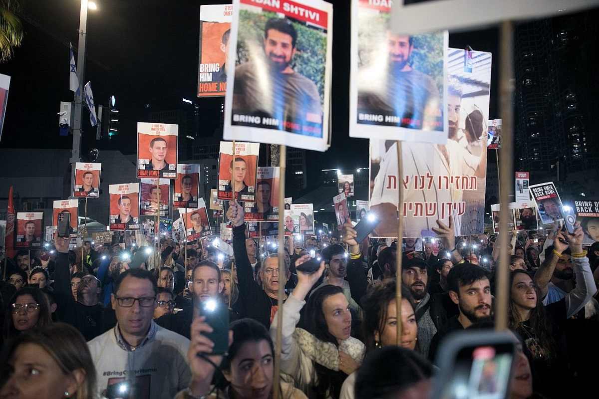 ប្រជាជនអ៊ីស្រាអែលចូលរួមការតវ៉ាទាមទារឲ្យដោះលែងជនជាតិអ៊ីស្រាអែលដែលត្រូវបានចាប់ខ្លួននៅតំបន់ហ្កាហ្សា។ រូបថត៖ Miriam Alster/Flash90 |