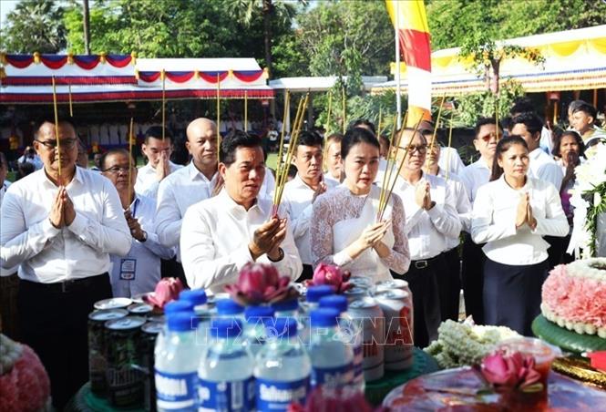 អភិបាលរាជធានីភ្នំពេញ លោក ឃួង ស្រេង និងប្រតិភូ ធ្វើពិធីអុជធូបរំលឹកវិញ្ញាណក្ខន្ធជនរងគ្រោះនៃរបបប្រល័យពូជសាសន៍ខ្មែរក្រហម។ រូបថត៖ AKP/VNA |