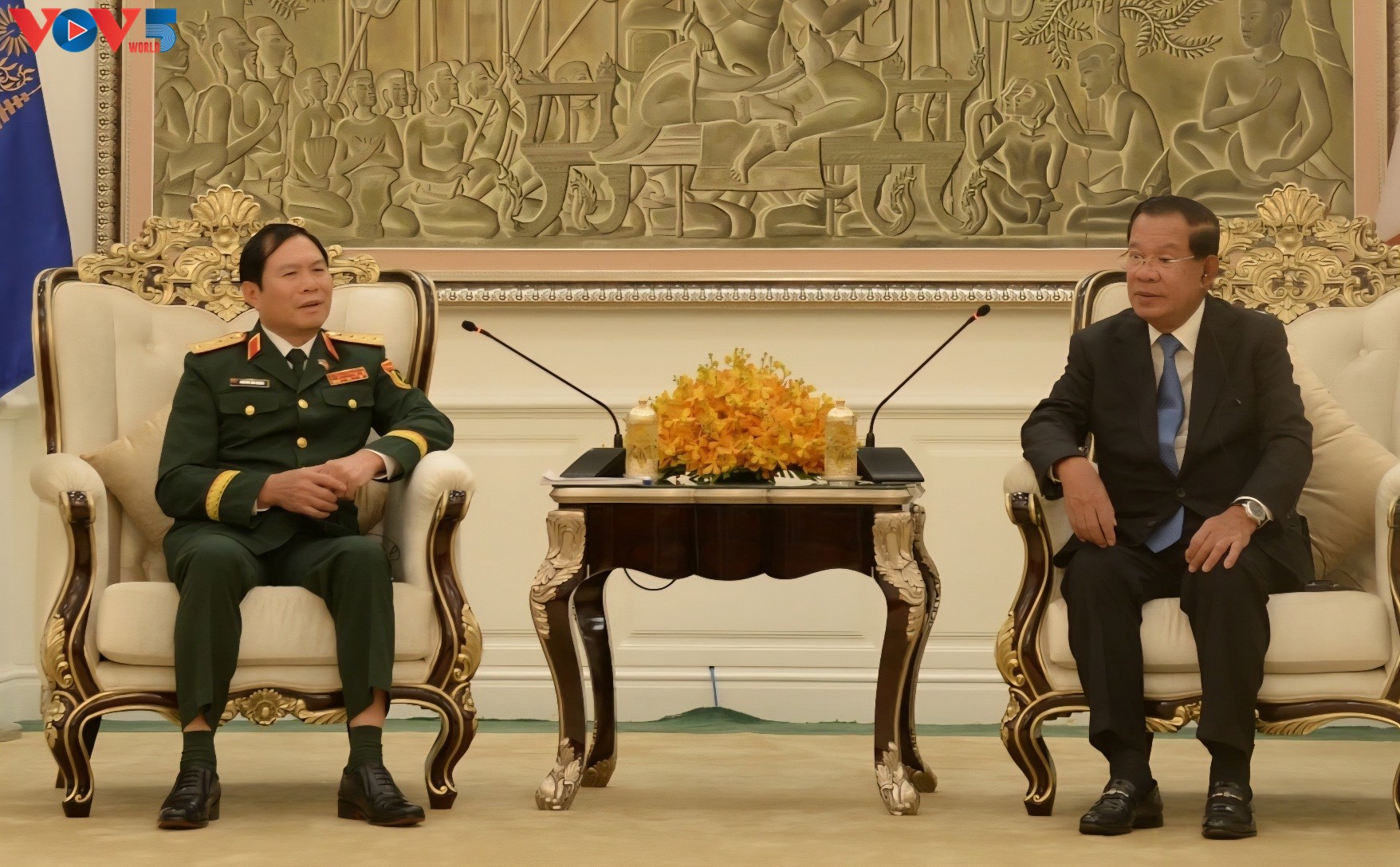 លោកនាយឧត្តមសេនីយ៍ Nguyen Tan Cuong និងប្រធានព្រឹទ្ធសភាកម្ពុជាសម្តេចតេជោ ហ៊ុន សែន។ រូបថត៖ VOV |