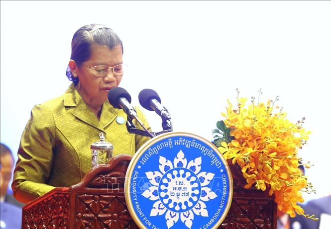 លោកស្រី ម៉ែន សំអន ប្រធានក្រុមប្រឹក្សាជាតិរណសិរ្សសាមគ្គីអភិវឌ្ឍន៍មាតុភូមិកម្ពុជា ថ្លែងសុន្ទរកថានៅពិធីអបអរសាទរ។ (រូបថត៖ VNA) |