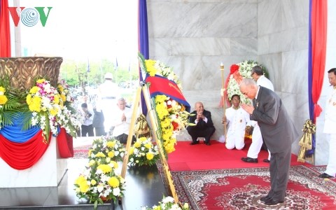 | ព្រះមហាក្សត្រកម្ពុជា នរោត្តម សីហមុនី ដាក់តម្រងផ្កានៅវិមានឯករាជ្យ។ |