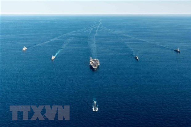 នាវាទ័ពជើងទឹកចូលរួមក្នុងសមយុទ្ធយោធារួមគ្នារវាងអាមេរិក ជប៉ុន និងកូរ៉េខាងត្បូង នៅក្នុងតំបន់សមុទ្រភាគខាងកើតនៃឧបទ្វីបកូរ៉េ ថ្ងៃទី ៣០ ខែកញ្ញា ឆ្នាំ ២០២២។ រូបថត៖ Yonhap/VNA |