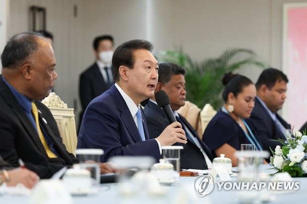 លោកប្រធានាធិបតី Yoon Suk-yeol ថ្លែងមតិក្នុងកិច្ចប្រជុំជាមួយនាយករដ្ឋមន្ត្រី និងរដ្ឋមន្ត្រីការបរទេសមកពីប្រទេសកោះប៉ាស៊ីហ្វិកចំនួន ១២ នៅថ្ងៃទី ២៧ ខែតុលា ឆ្នាំ ២០២២។ ប្រភព៖ Yonhap |