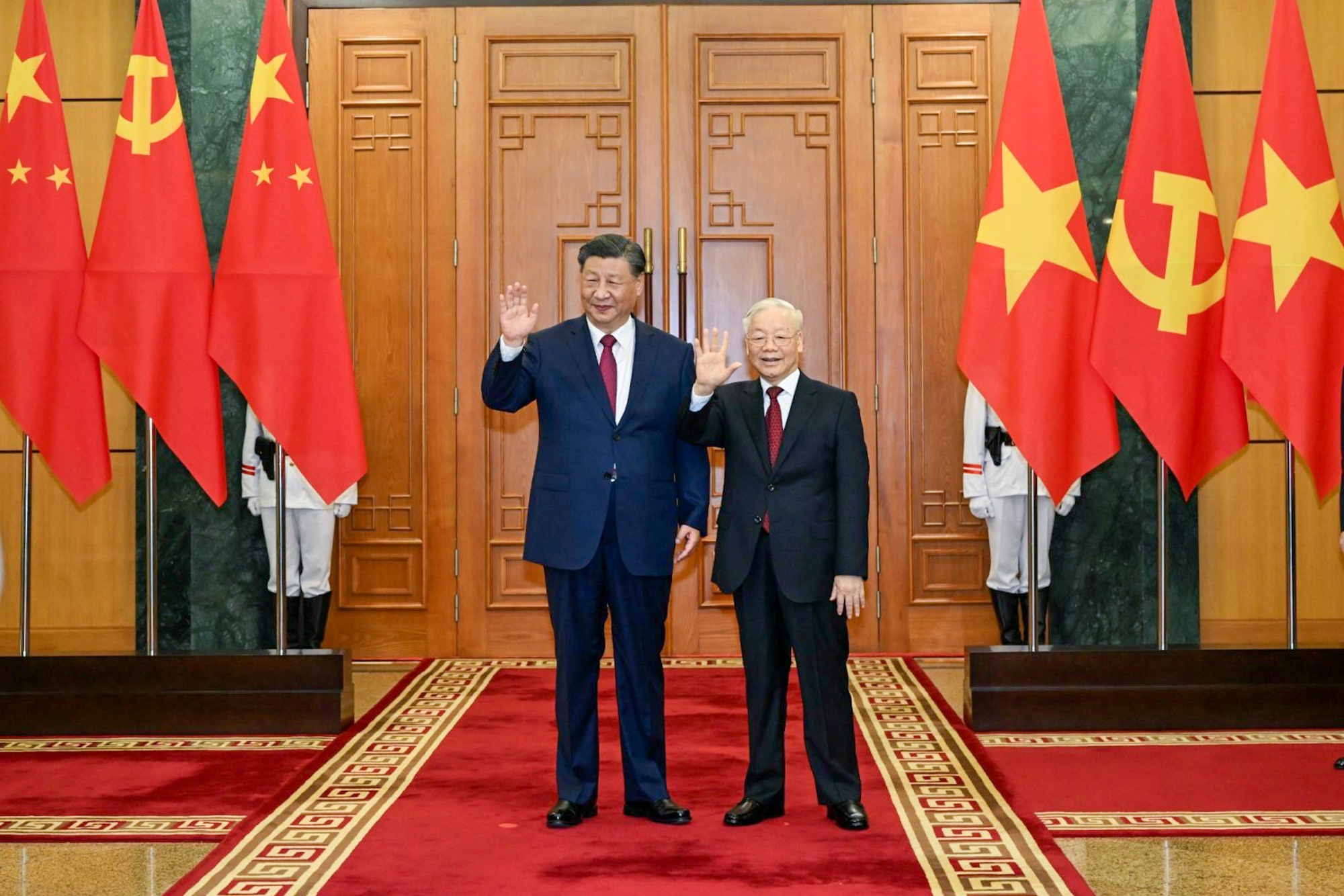 អគ្គលេខាគណៈកម្មាធិការមជ្ឈិមបក្សកុម្មុយនិស្តវៀតណាម លោក Nguyen Phu Trong និងអគ្គលេខាបក្ស ប្រធានរដ្ឋចិន លោក Xi Jinping។ (រូបថត៖ VGP) |