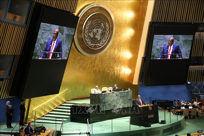 លោក Dennis Francis ប្រធានមហាសន្និបាតអង្គការសហប្រជាជាតិនីតិកាលទី៧៨ ថ្លែងក្នុងសម័យប្រជុំពេញអង្គលើកដំបូងនៃមហាសន្និបាតនៅទីក្រុងញូវយ៉ក (សហរដ្ឋអាមេរិក)។ រូបថត៖ THX/TTXVN |