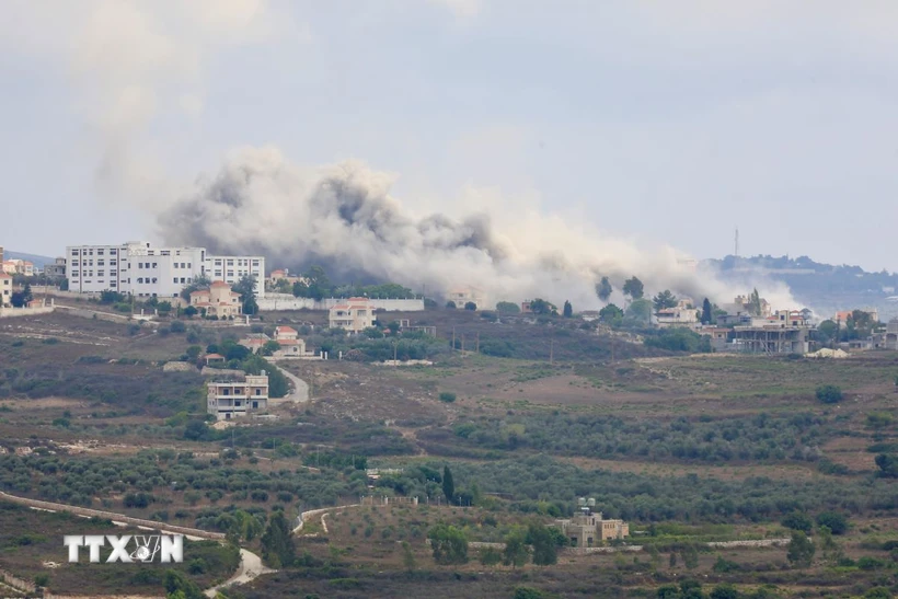 ផ្សែងហុយឡើងបន្ទាប់ពីការវាយប្រហារតាមផ្លូវអាកាសរបស់អ៊ីស្រាអែលទៅលើ Tayr Harfa ប្រទេសលីបង់។ រូបថត៖ THX/TTXVN |