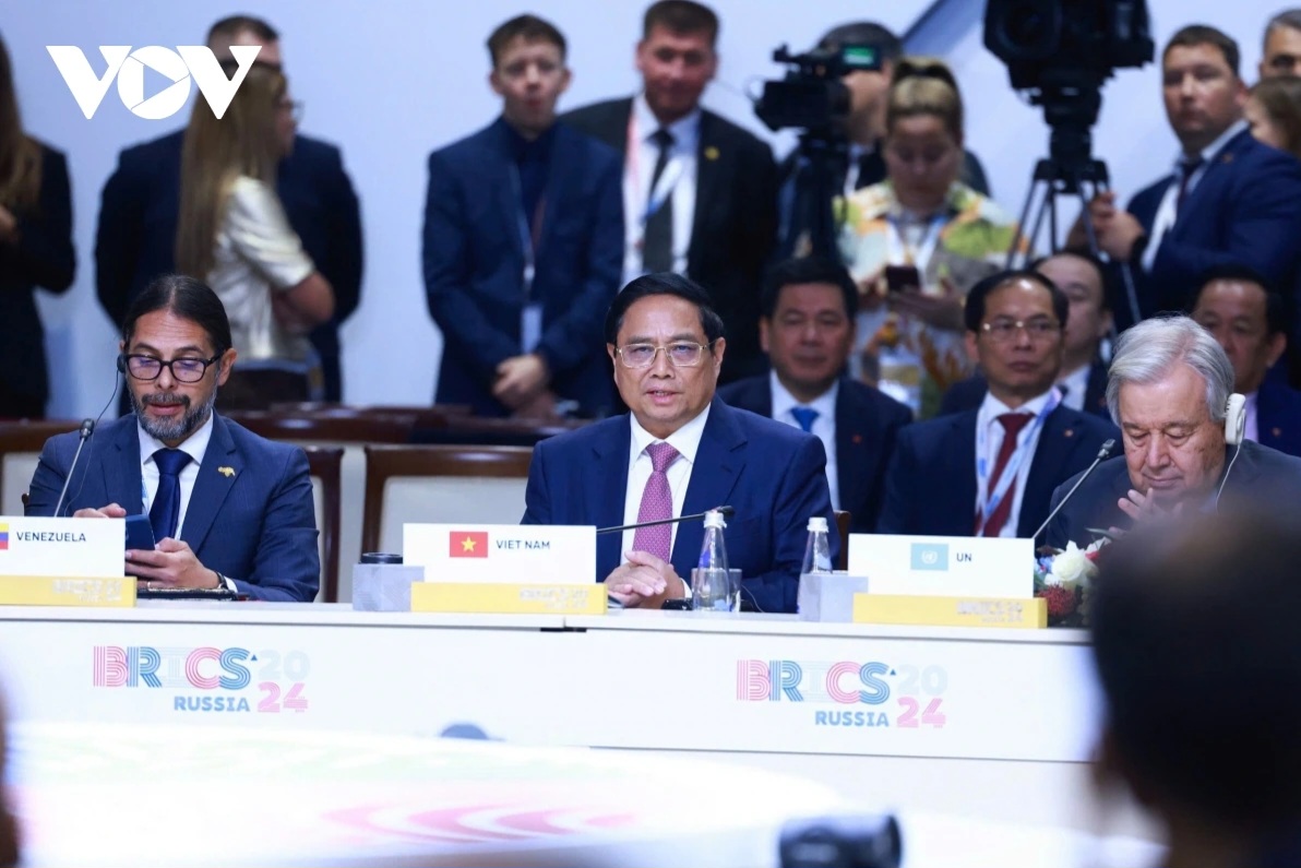 នាយករដ្ឋមន្ត្រី លោក ហ្វាម មីញជីញ បានចូលរួមសម័យប្រជុំពេញអង្គនៃកិច្ចប្រជុំថ្នាក់ដឹកនាំ BRICS បើកទូលាយ ឆ្នាំ ២០២៤។ រូបថត៖ VOV |