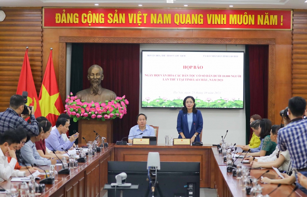 អនុរដ្ឋមន្ត្រីក្រសួងវប្បធម៌ កីឡា និងទេសចរណ៍ លោកស្រី Trinh Thi Thuy និងអនុប្រធានអចិន្ត្រៃយ៍គណៈកម្មាធិការប្រជាជនខេត្ត Lai Chau លោក Tong Thanh Hai បានធ្វើជាអធិបតីក្នុងសន្និសីទកាសែត។ រូបថត៖ VOV |