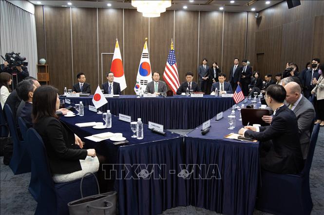 កិច្ចប្រជុំរវាងភាគីទាំងបីនៅទីក្រុងសេអ៊ូល ថ្ងៃទី៧ មេសា ២០២៣។ (រូបថត៖ AFP/TTXVN) |