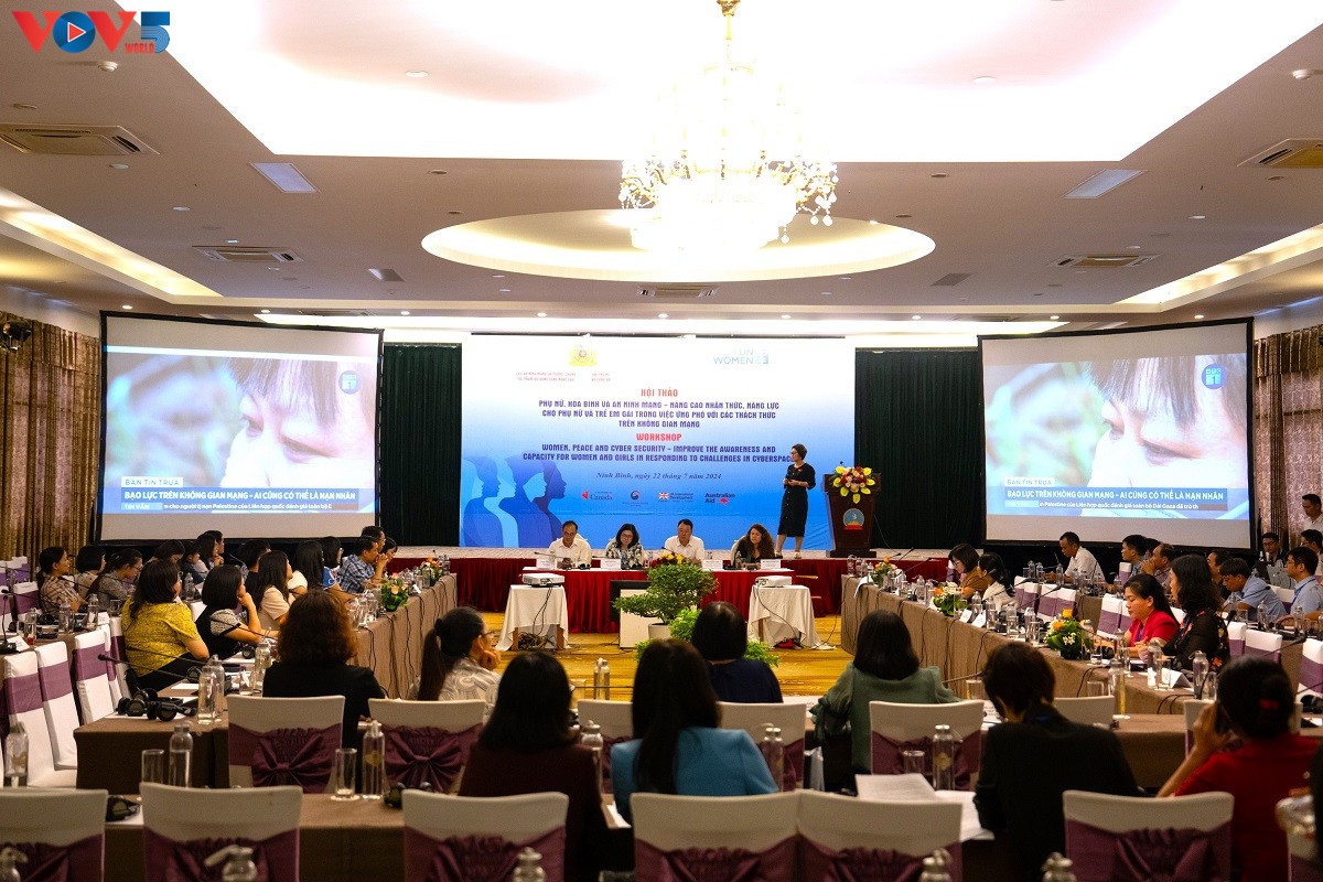 សិក្ខាសាលា "ស្ត្រី សន្តិភាព និងសន្តិសុខតាមអ៊ីនធឺណិត - លើកកម្ពស់ការយល់ដឹង និងសមត្ថភាពសម្រាប់ស្ត្រី និងកុមារី ក្នុងការឆ្លើយតបទៅនឹងបញ្ហាប្រឈមនៅលើអ៊ីនធឺណិត"។ រូបថត៖ Kim Thanh/VOV |