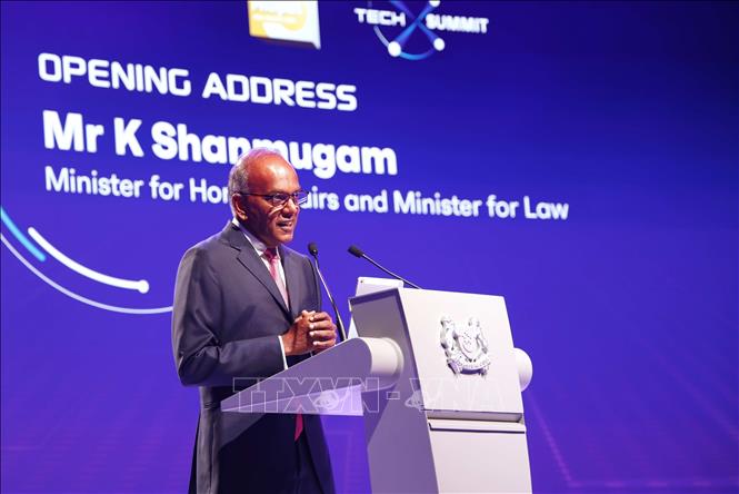រដ្ឋមន្ត្រីក្រសួងមហាផ្ទៃ និងជារដ្ឋមន្ត្រីក្រសួងច្បាប់សិង្ហបុរី K.Shanmugam ថ្លែងសុន្ទរកថាបើកនៅក្នុងសន្និសីទ (រូបថត៖ TTXVN) |