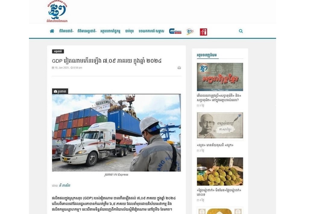 កាសែតអេឡិចត្រូនិក ThmeyThmey ចុះផ្សាយអត្ថបទមួយដែលមានចំណងជើងថា “កំណើន GDPរបស់វៀតណាម ឈានដល់ ៧.០៩% ក្នុងឆ្នាំ ២០២៤” នៅរសៀលថ្ងៃទី១៨ ខែមករា ឆ្នាំ២០២៥។ រូបថត៖ VNA |