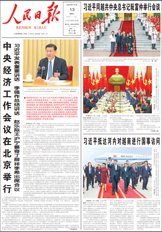 រូបថតនៃដំណើរទស្សនកិច្ចរបស់អគ្គលេខាបក្ស និងជាប្រធានរដ្ឋចិន លោក Xi Jinping ទៅកាន់ប្រទេសវៀតណាម នៅលើទំព័រមុខនៃកាសែត People's Daily ចុះនៅថ្ងៃទី ១៣ ខែធ្នូ។ (រូបថត៖ VOV-Beijing) |