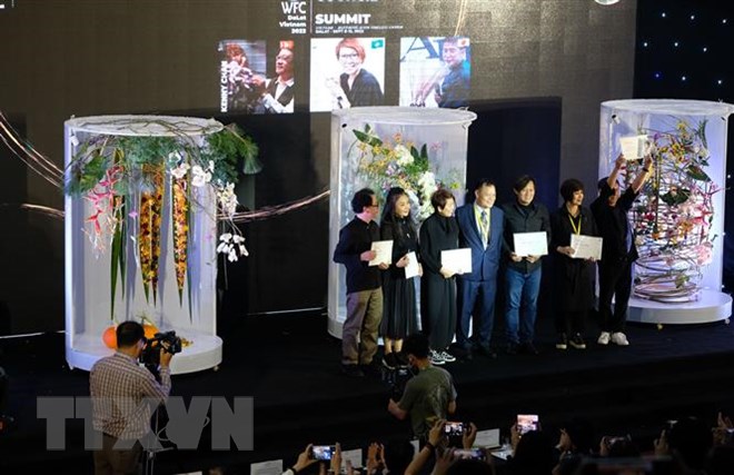 លោក Efren Chatto ប្រធានសមាគមផ្កាពិភពលោក ប្រគល់វិញ្ញាបនបត្រដល់វិចិត្រករអន្តរជាតិចំនួន ៦ រូបដែលសម្តែងក្នុងពិធីបើកការប្រលងសិល្បៈតុបតែងផ្កាអន្តរជាតិ ឆ្នាំ ២០២៣ (រូបថត៖TTXVN) |