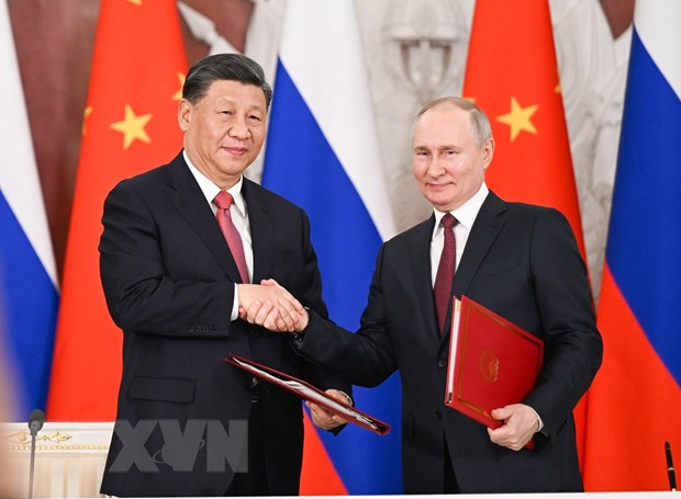 ប្រធានាធិបតីរុស្ស៊ី លោក វ្ល៉ាឌីមៀ ពូទីន (ស្តាំ) និងប្រធានរដ្ឋចិន លោក ស៊ី ជីនពីង ក្នុងពិធីចុះហត្ថលេខាលើសេចក្តីថ្លែងការណ៍រួមស្តីពីការពង្រឹងភាពជាដៃគូសហប្រតិបត្តិការយុទ្ធសាស្ត្រលើគ្រប់ជ្រុងជ្រោយរុស្ស៊ី-ចិនក្នុងយុគសម័យថ្មី នៅទីក្រុងមូស្គូ ថ្ងៃទី ២១ ខែមីនា ឆ្នាំ ២០២៣ (រូបថត៖ THX/TTXVN) |