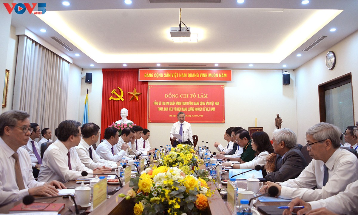 អគ្គលេខាក្ស លោក តូ ឡឹម អញ្ជើញថ្លែងក្នុងជំនួបធ្វើការជាមួយវិទ្យាស្ថានថាមពលអាតូមិកវៀតណាម (រូបថត៖ Van Hieu/VOV) |