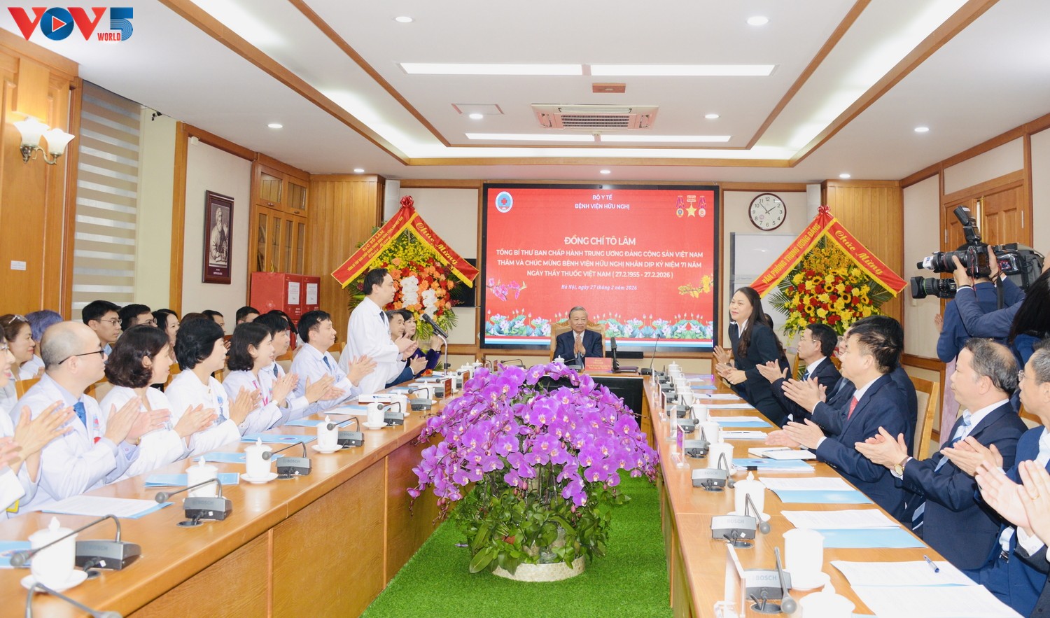 អគ្គលេខាបក្ស លោកតូ ឡឹម បានអញ្ជើញទៅសួរសុខទុក្ខ និងជូនពរដល់កម្មាភិបាល បុគ្គលិកពេទ្យនៃមន្ទីរពេទ្យមិត្តភាព ក្នុងឱកាសខួបលើកទី ៧១ នៃទិវាគ្រូពេទ្យវៀតណាម (២៧ កុម្ភៈ ១៩៥៥ - ២៧ កុម្ភៈ ២០២៦)។ រូបថត៖ VOV |