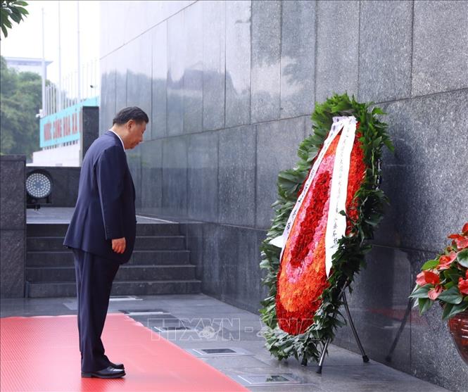អគ្គលេខាបក្ស ប្រធានរដ្ឋចិនលោក Xi Jinping អញ្ជើញមកដាក់កម្រងផ្កា និងចូលគោរពវិញ្ញាណក្ខន្ធលោកប្រធានហូជីមិញ។ (រូបថត៖ VNA) |