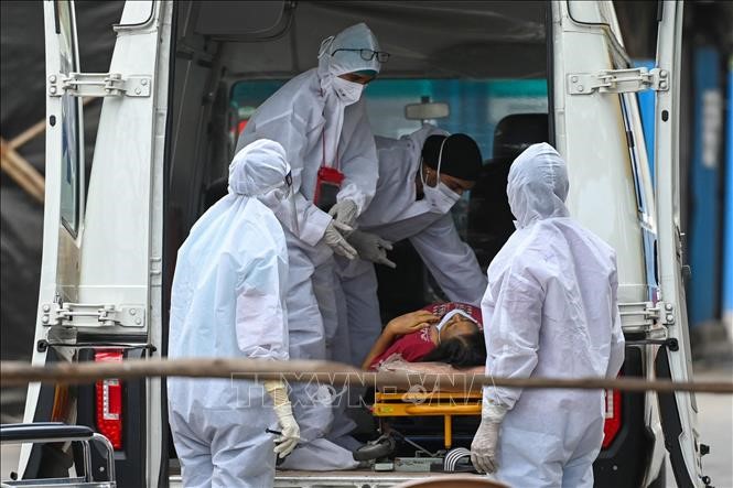 បុគ្គលិកពេទ្យបញ្ជូនអ្នកជម្ងឺ កូវីដ ១៩ ទៅកាន់មជ្ឈមណ្ឌលសុខាភិបាលនៅ Mumbai ឥណ្ឌា។ (រូបថត៖ AFP/VNA) |