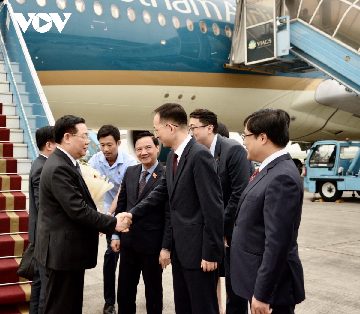 ថ្នាក់ដឹកនាំស្ថានទូតចិនប្រចាំនៅវៀតណាម ទទួលស្វាគមន៍ប្រធានរដ្ឋសភា លោក Vuong Dinh Hue នៅព្រលានយន្តហោះ Noi Bai។ (រូបថត៖ VOV) |