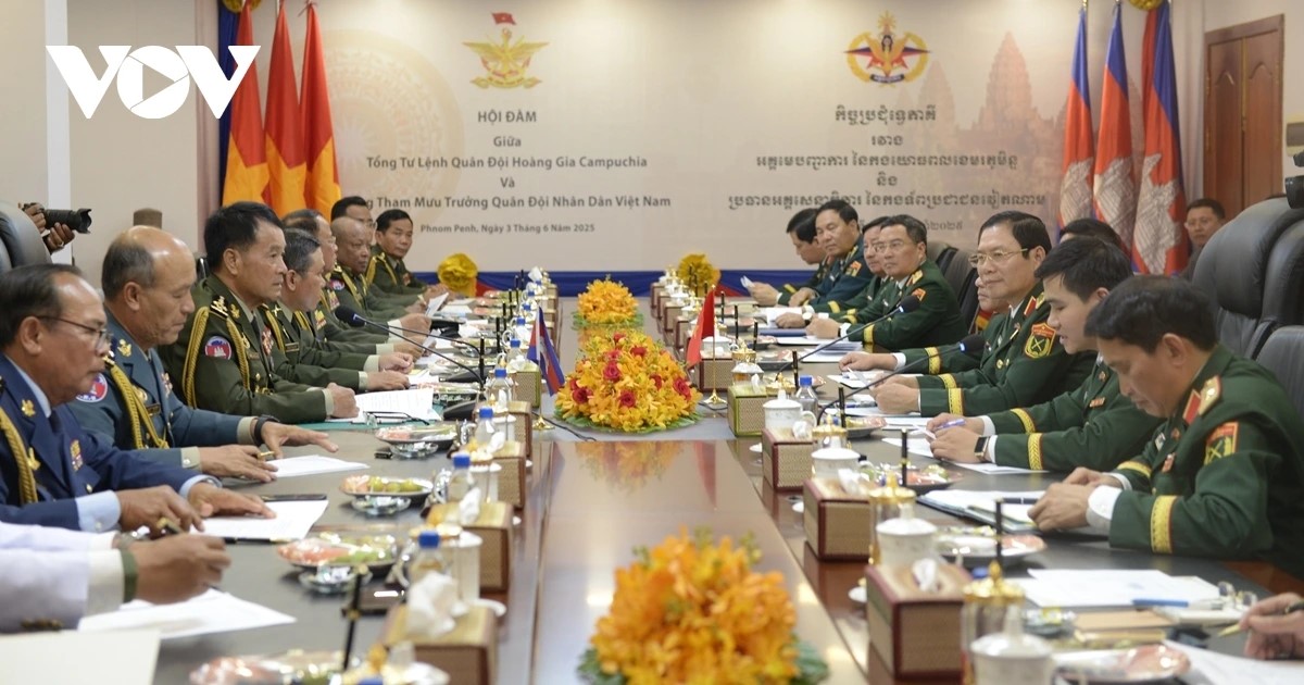 នាយឧត្តមសេនីយ៍លោក វង្ស ពិសេន អគ្គមេបញ្ជាការរងនៃកងយោធពលខេមរភូមិន្ទ បានអញ្ជើញជាអធិបតីក្នុងពិធីទទួលស្វាគមន៍យ៉ាងអធិកអធមចំពោះ នាយឧត្តមសេនីយ៍ លោក ង្វៀន តឹន គឿង ប្រធានអគ្គសេនាធិការកងទ័ពប្រជាជនវៀតណាម អនុរដ្ឋមន្ត្រីក្រសួងការពារប្រទេស និងគណៈប្រតិភូយោធាជាន់ខ្ពស់នៃកងទ័ពប្រជាជនវៀតណាមមកបំពេញទស្សនកិច្ចផ្លូវការនៅកម្ពុជា (រូបថត៖ PV/VOV-ភ្នំពេញ) |