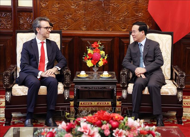 ប្រធានរដ្ឋលោក Vo Van Thuong បានអញ្ជើញទទួលជួបលោក Giorgio Aliberti ឯកអគ្គរដ្ឋទូត-ប្រធានស្ថានបេសកម្មសហភាពអឺរ៉ុប (EU) ប្រចាំនៅវៀតណាម (រូបថត៖ VNA) |