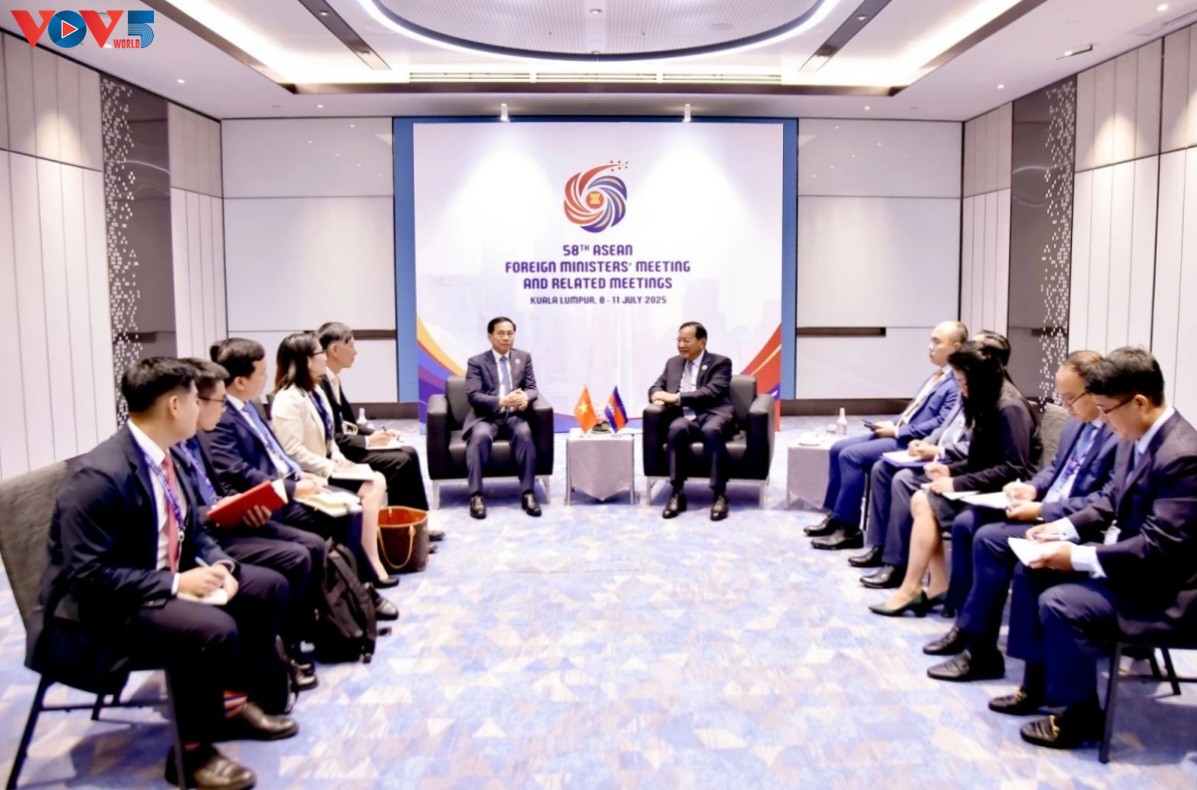 ឧបនាយករដ្ឋមន្ត្រី រដ្ឋមន្ត្រីការបរទេស លោក ប៊ុយ ថាញ់ សឺន ជួបជាមួយឧបនាយករដ្ឋមន្ត្រី ប្រាក់ សុខុន រដ្ឋមន្ត្រីក្រសួងការបរទេស និងសហប្រតិបត្តិការអន្តរជាតិកម្ពុជា (រូបថត៖ VOV) |