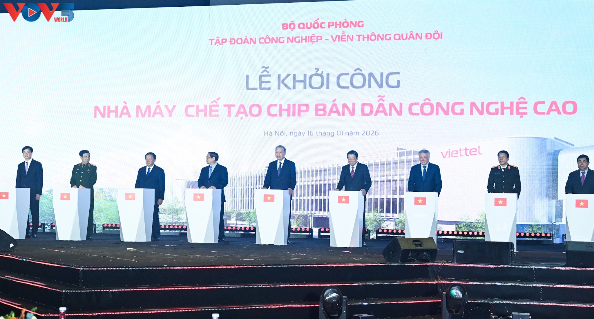 អគ្គលេខាបក្ស លោក តូ ឡឹម និងនាយករដ្ឋមន្ត្រីលោក ហ្វាម មិញជីញ អញ្ជើញធ្វើពិធីបើកការដ្ឋានសាងសង់រោងចក្រផលិតបន្ទះឈីប ស៊ីមីកុងដុកទ័រ បច្ចេកវិទ្យាខ្ពស់ (រូបថត៖ VOV) |