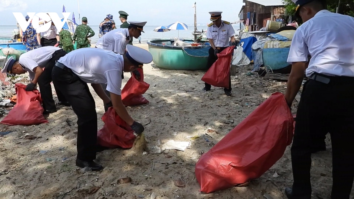 សមាជិកសម្ព័ន្ធយុវជននៃកងនាវាទ័ពជើងទឹកលេខ១២៩ ចូលរួមប្រមូលសំរាមនៅតំបន់ឆ្នេរនៃក្រុង Long Hai ស្រុក Long Dien។ (រូបថត៖ VOV) |
