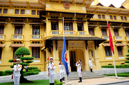 | ពិធីបង្ហូតទង់អាស៊ាននិងទង់ជាតិវៀតណាមនៅទីស្ដីការរបស់ក្រសួងការបរទេសវៀតណាម |