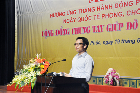 វៀតណាម ក្រសួងការងារ យុទ្ធជនពិការនិងសង្គមកិច្ចវៀតណាម សហការ ជាមួយគណៈកម្មាធិការប្រជាជនខេត្ត Vinh Phuc បានរៀបចំពិធីមិទ្ទីងជួយជ្រោម ជ្រែងខែសកម្មភាពបង្ការប្រឆាំងគ្រឿងញ្ញៀនឆ្នាំ២០១៥ ដោយប្រធានបទ “សហគមន៍រួមដៃជួយឧបត្ថម្ភជនញៀនគ្រឿងញៀន”។ ថ្លែងមតិក្នុងពិធី ឧបនា យករដ្ឋមន្ត្រីរដ្ឋាភិបាលវៀតណាម លោកVu Duc Dam បានអំពាវនាវឲ្យសហ គមន៍កុំរើសអើងចំពោះជនញៀនគ្រឿងញ្ញៀន ហើយត្រូវជួយឲ្យពួកគាត់ សម្របខ្លួនចូលក្នុងសង្គមនិងមានជីវភាពរស់នៅដូចជាជនធម្មតាវិញ។ ចូលរួម