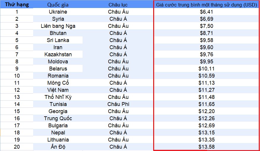 លទ្ធផលគឺ វៀតណាមជាប់ចំណាត់ថ្នាក់លេខ ៦ នៅតំបន់អាស៊ី ហើយជាប់ថ្នាក់លេខ ១២ នៅលើពិភពលោក និងជាប់ចំណាត់ថ្នាក់លេខ ១ នៅអាស៊ីអាគ្នេយ៍ អំពីតម្លៃសេវាកម្មអ៊ីនធឺណិតថោក។ ជាមធ្យម អ្នកប្រើប្រាស់អ៊ីនធឺណិតនៅ វៀតណាមនឹងចំណាយ ១១,២៧ ដុល្លារ (ស្មើនឹង ២៦០ ០០០ ដុង) សម្រាប់មួយខែដើម្បីប្រើប្រាស់អ៊ីនធឺណិតផងដែរ៕