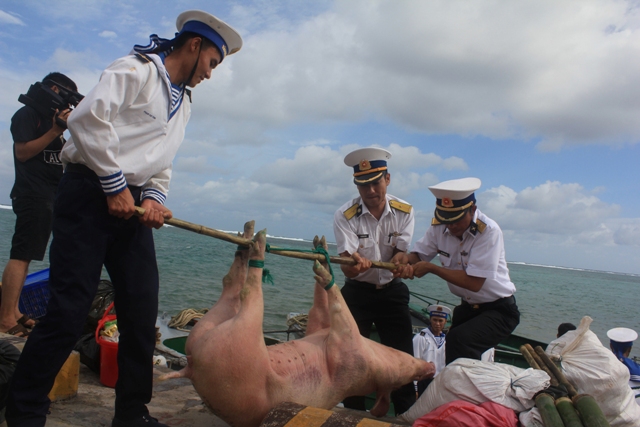 លើ ដែនកោះដ៏ដែលស្ថិតនៅប្រជុំកោះ Truong Sa ស្រុក Truong Sa ខេត្ត Khanh Hoa (ភាគកណ្ដាលវៀតណាម) រួមគ្នារៀបចំទទួលបុណ្យតេតប្រពៃណីឆ្នាំមមែសប្តស័ក