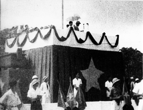 | លោកប្រធានហូជីមិញថ្លែងសេចក្តីប្រកាសឯករាជ្យបង្កើតសាធារណរដ្ឋប្រជាធិយតេយ្យ វៀតណាមនាថ្ងៃទី២កញ្ញា១៩៤៥នៅទីលាន Ba Dinh(រូបថត អិនធឺណែត) |